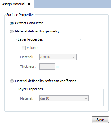 This option allows the user to select a custom material and a thickness value for the selected objects and/or surfaces. If the ‘Volume’ option is selected, the objects (not surfaces) will be transformed to a volume and this property will be considered for the meshing and simulation.