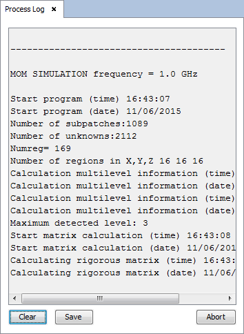 In this panel, the program shows the process log of the running simulation. Several actions may be performed within this panel: