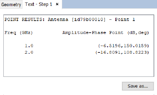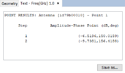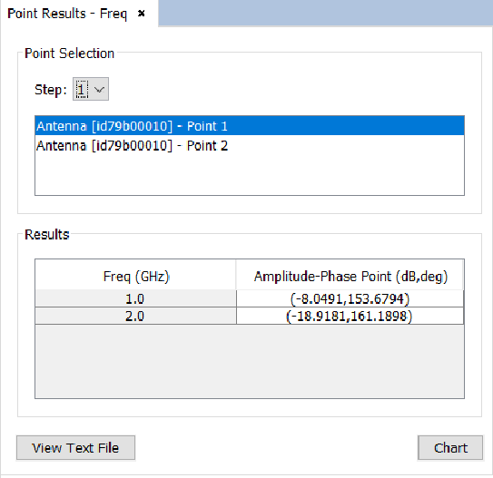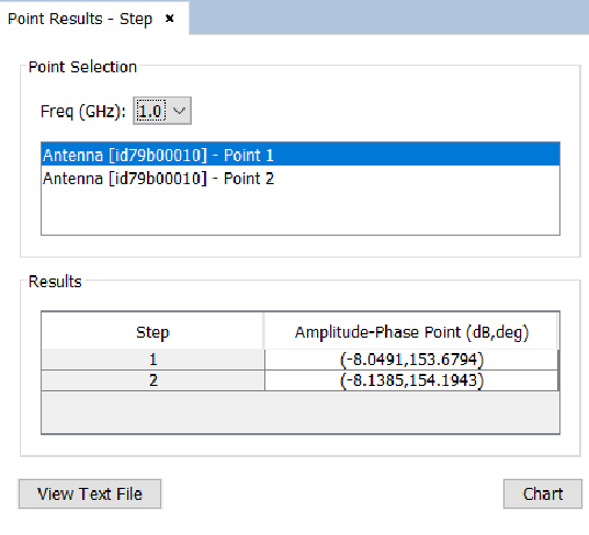 On this menu the user can select which point will be represented in the chart. In order to do so, the user must select first the point that will be represented and click on the first cell of the Amplitude-Phase Point column of the Results chart. It is also possible to specify a frequency band(Default value is 1.0). User can visualize in plain text the evolution of a point with a specified frequency with the View Text File button.
