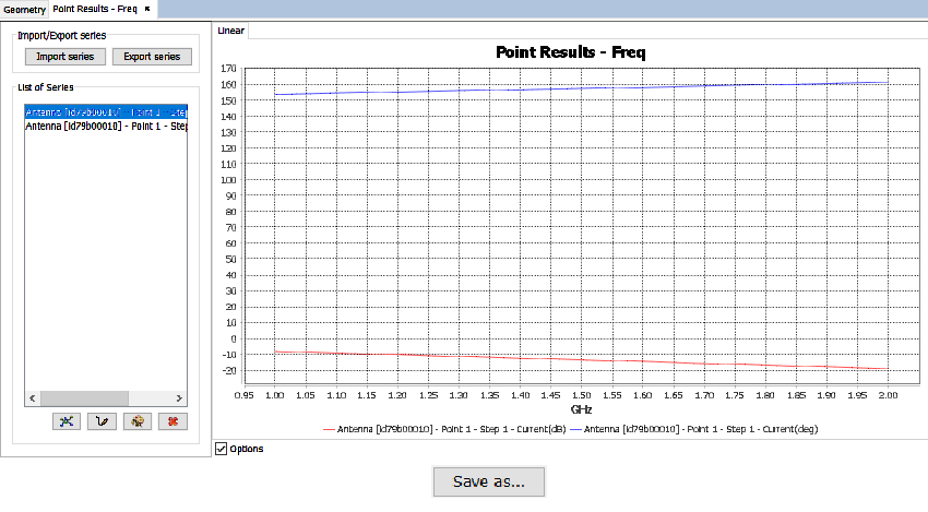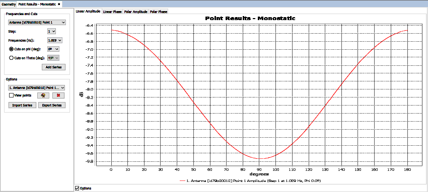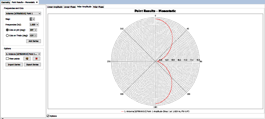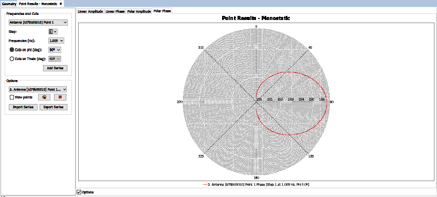 The user can also switch between the linear graph and the polar graph to visualize far field results. It is possible to visualize Linear Amplitude, Linear Phase, Polar Amplitude and Polar Phase by clicking on their respective tabs.