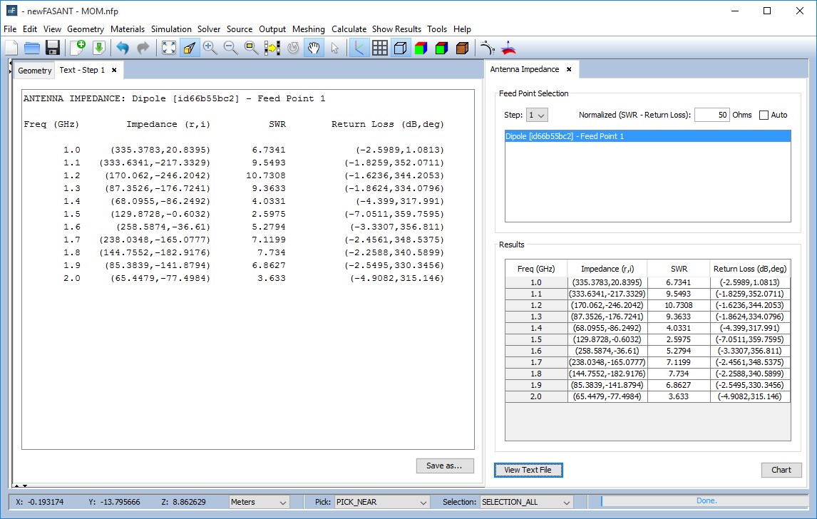 With this option, the user can visualize the calculated impedance results for each antenna and for each user defined frequency.