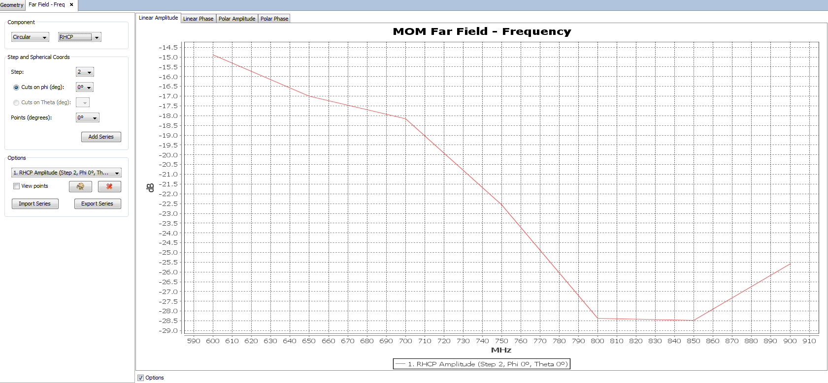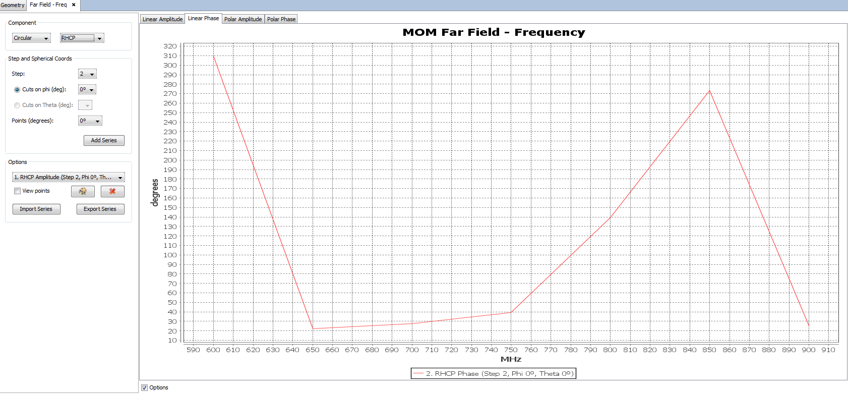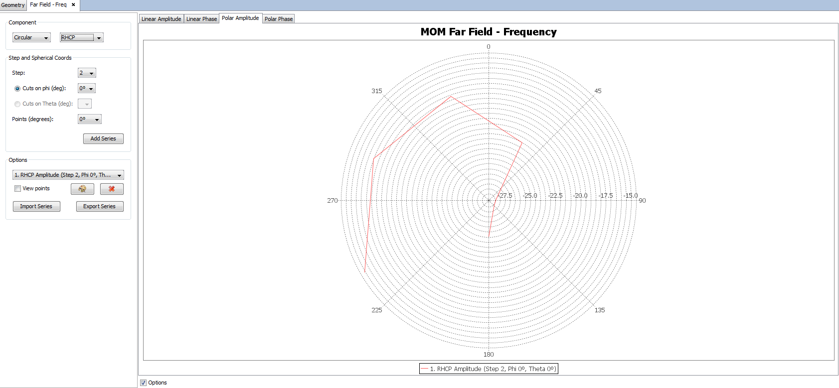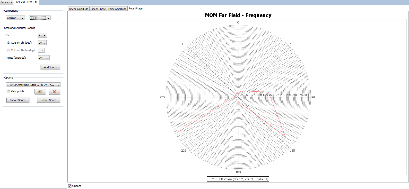 The user can also switch between the linear graph and the polar graph to visualize far field results. It is possible to visualize the Linear Phase, Polar Amplitude and Polar Phase by clicking on their respective tabs.