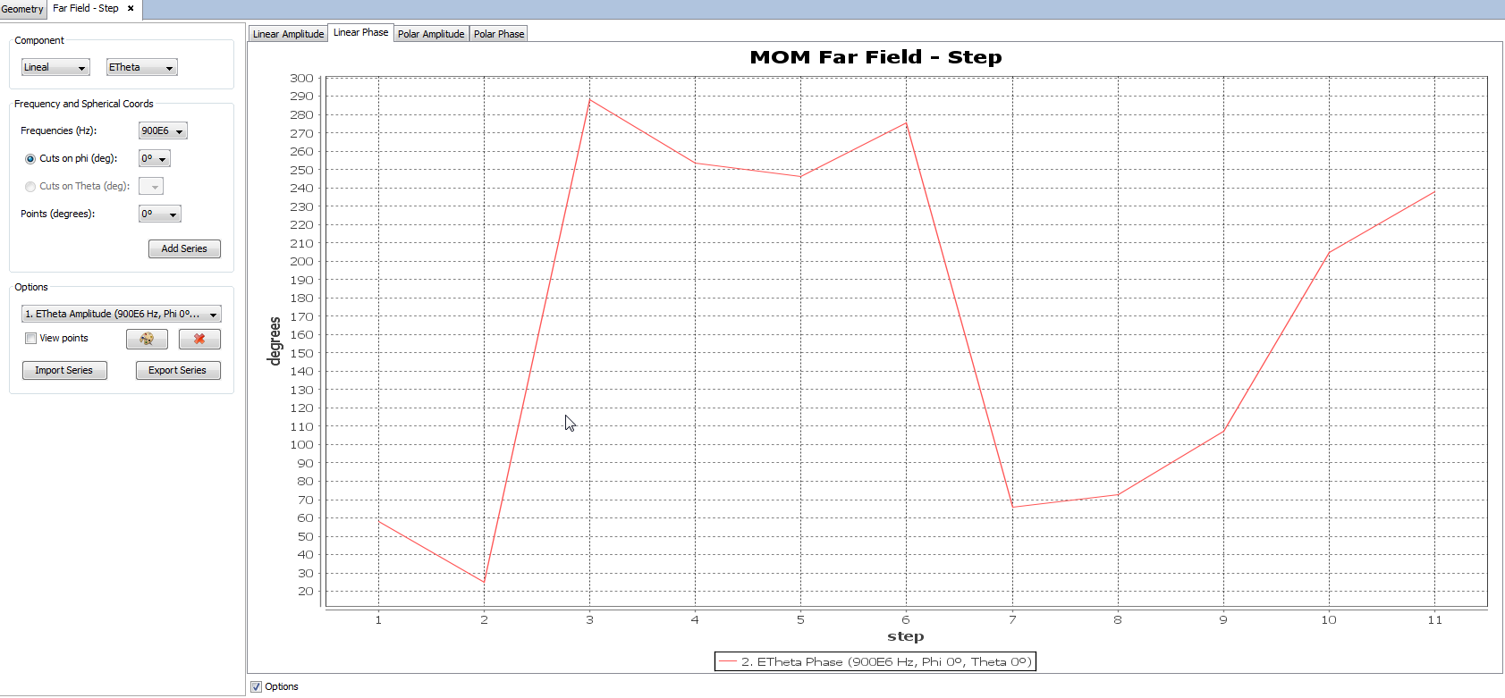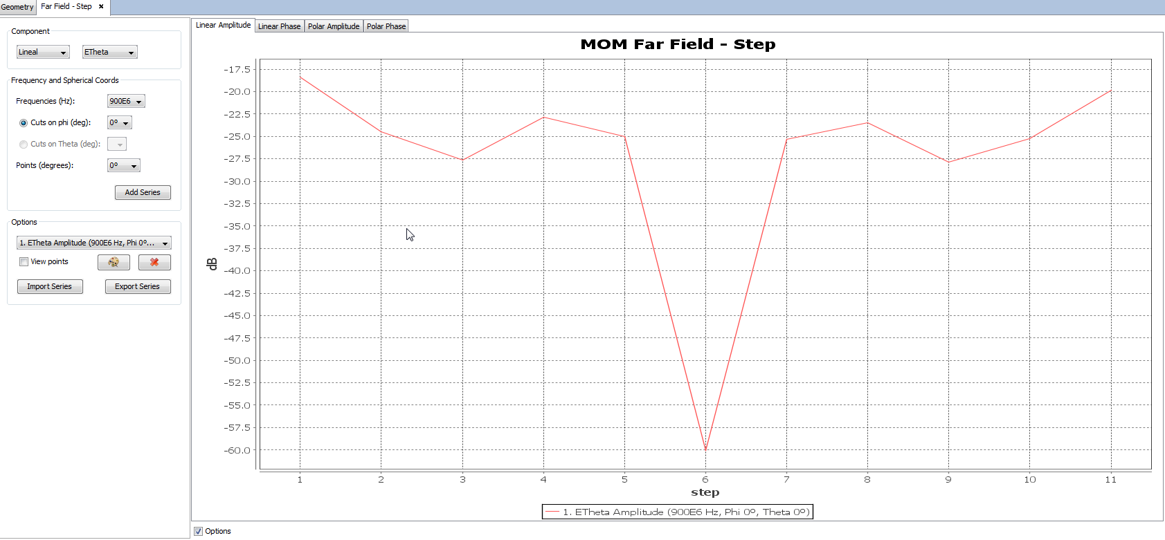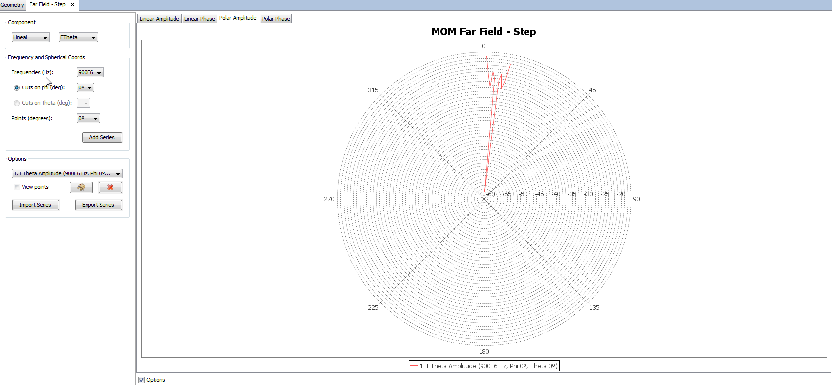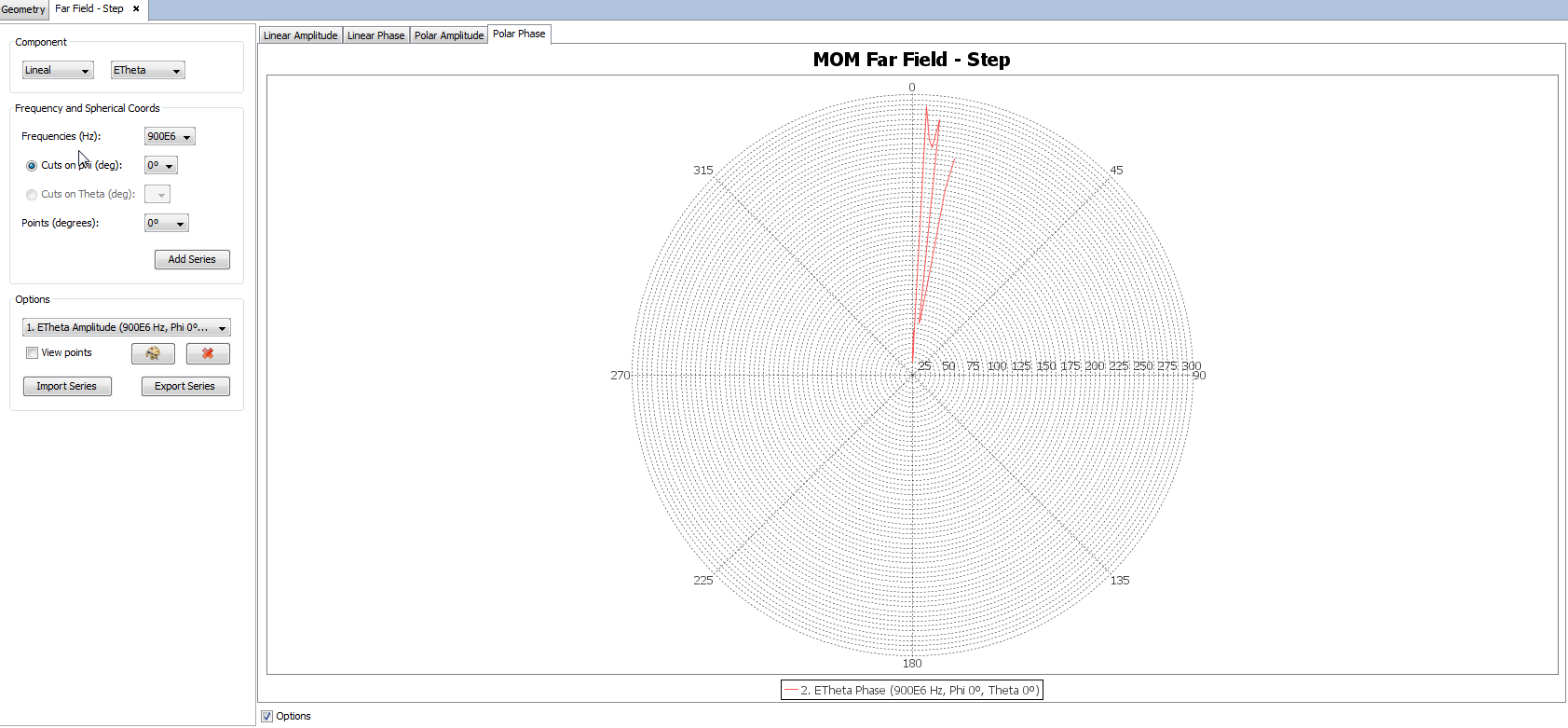 The user can also switch between the linear graph and the polar graph to visualize far field results. It is possible to visualize the Linear Phase, Polar Amplitude and Polar Phase by clicking on their respective tabs.