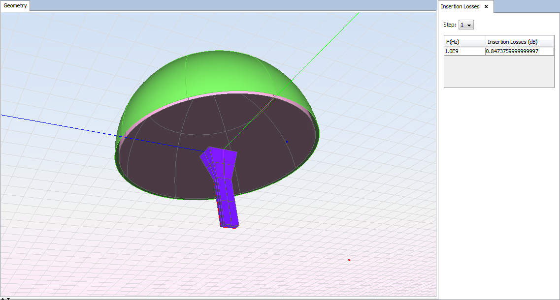 This option allows the user to visualize the values of the Insertion Losses only on simulations with some radome defined and the Calculate antenna results option activated on the radome definition window. User can visualize the Insertion Losses values for all frequencies of the selected simulation step.