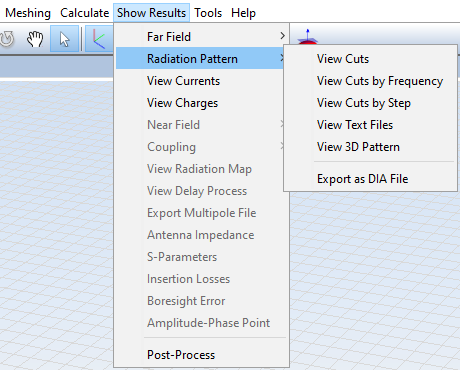 This menu is only enabled when the Method of Moments is selected on Solver section, and the option Compute 3D Pattern is selected in the Method of Moments. The angular step specified in the solver parameters is used for the whole spherical far field sweep, so this section allows to visualize results in these spherical coordinates.