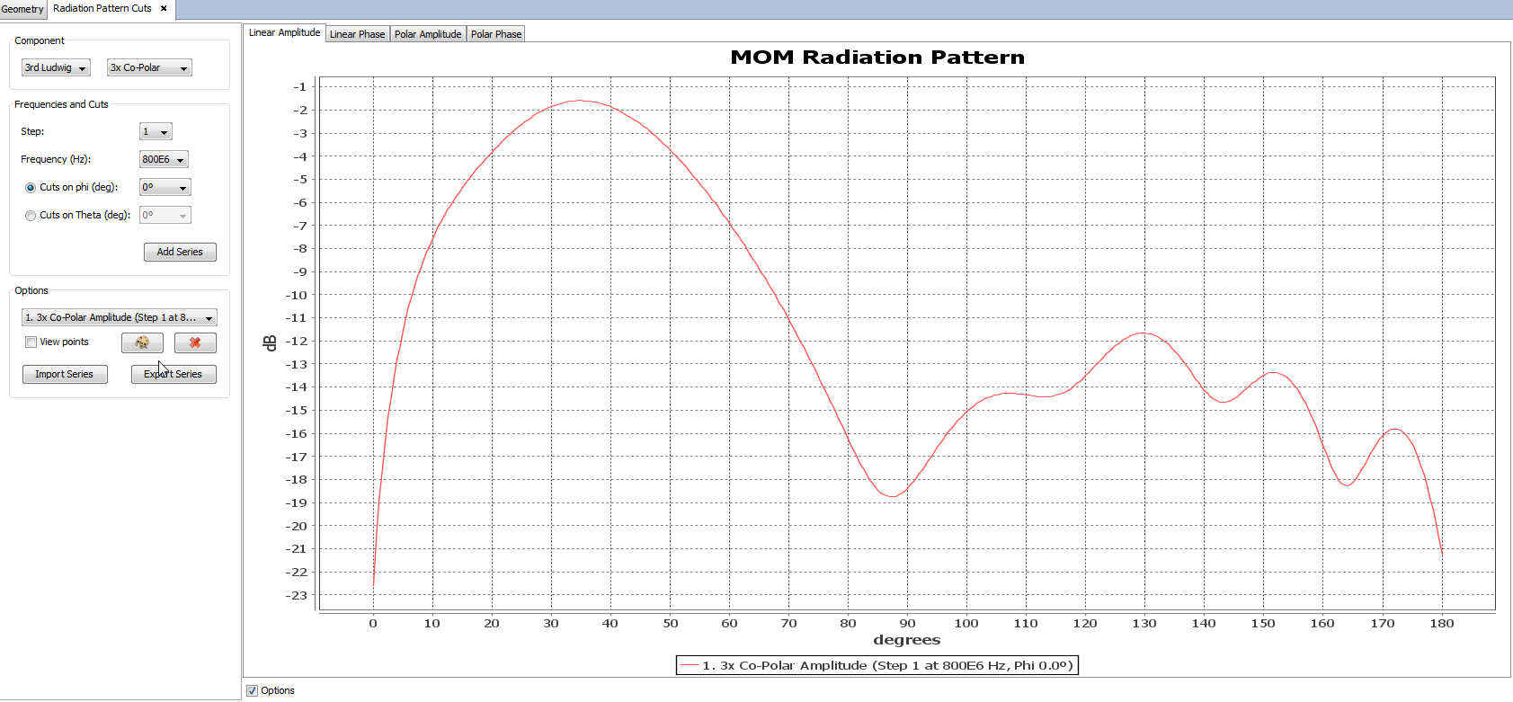 Figure 1. Radiation Pattern View Cuts panel. Linear Amplitude