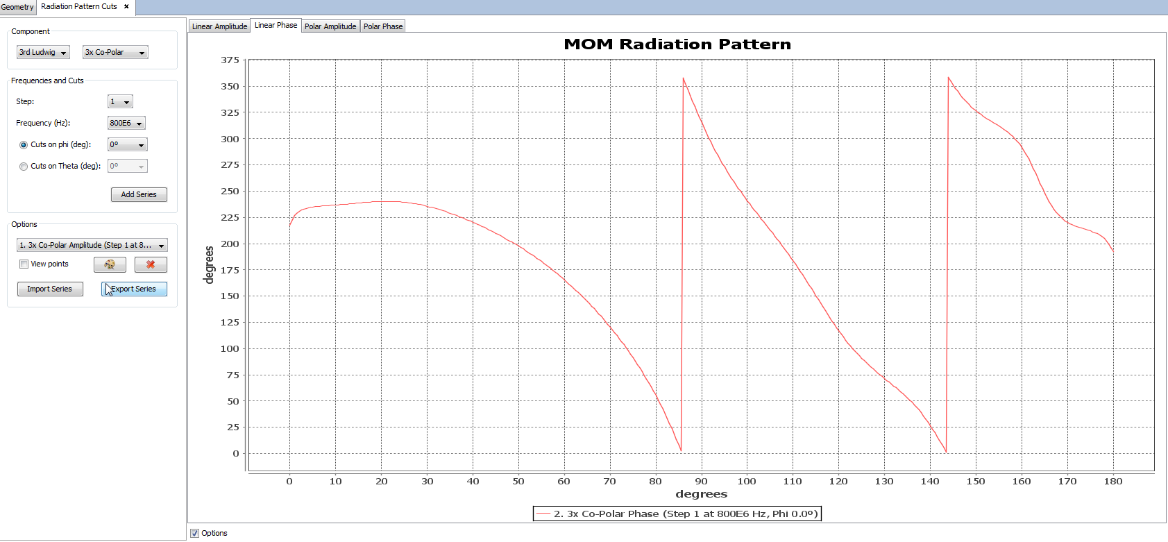 Figure 2. Radiation Pattern View Cuts panel. Linear Phase