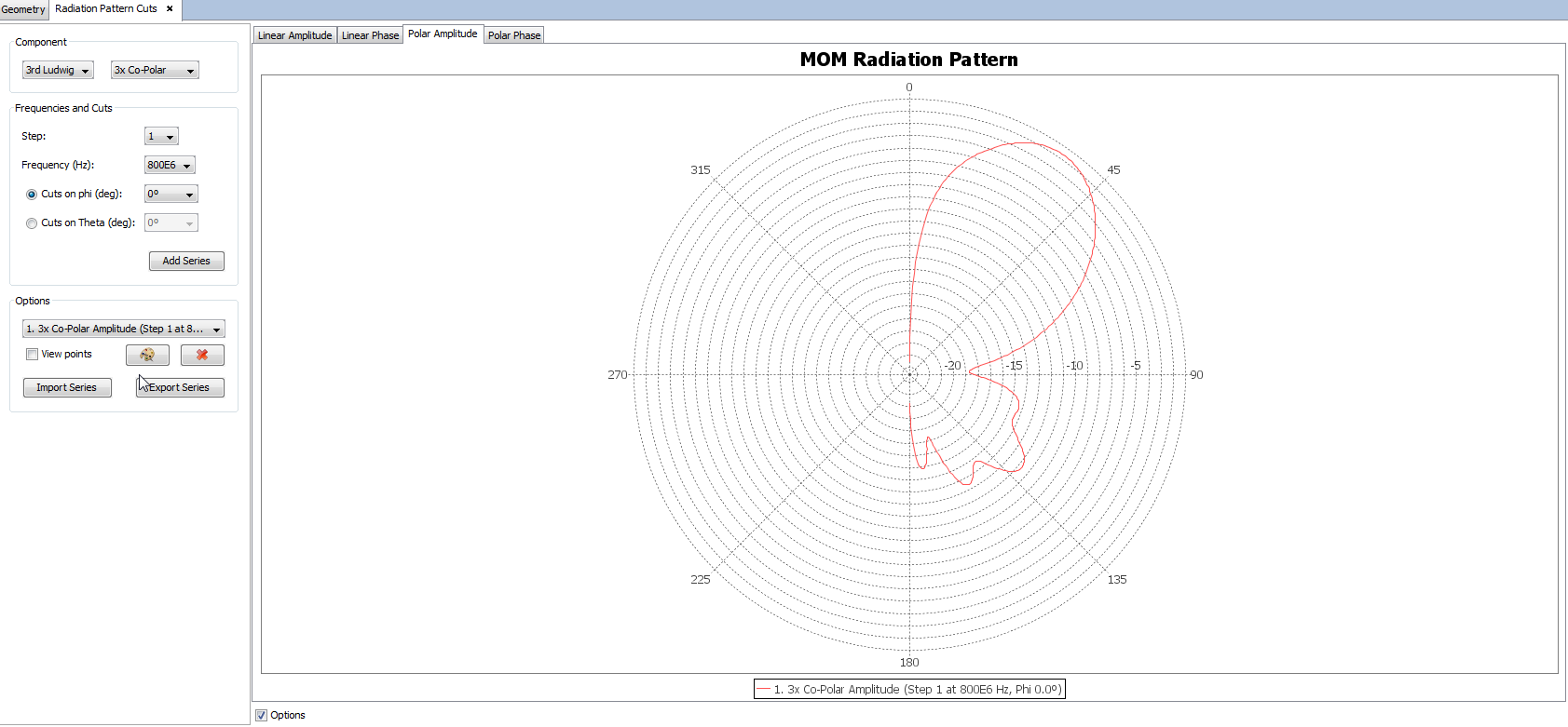 Figure 3. Radiation Pattern View Cuts panel. Polar Amplitude