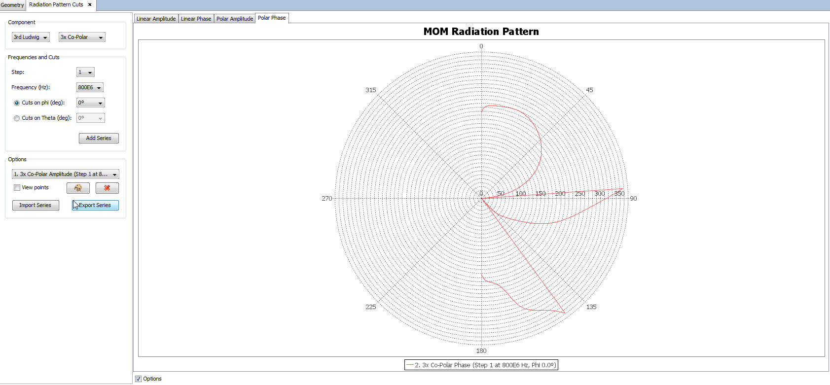 The user can also switch between the linear graph and the polar graph to visualize far field results. It is possible to visualize the Linear Phase, Polar Amplitude and Polar Phase by clicking on their respective tabs.