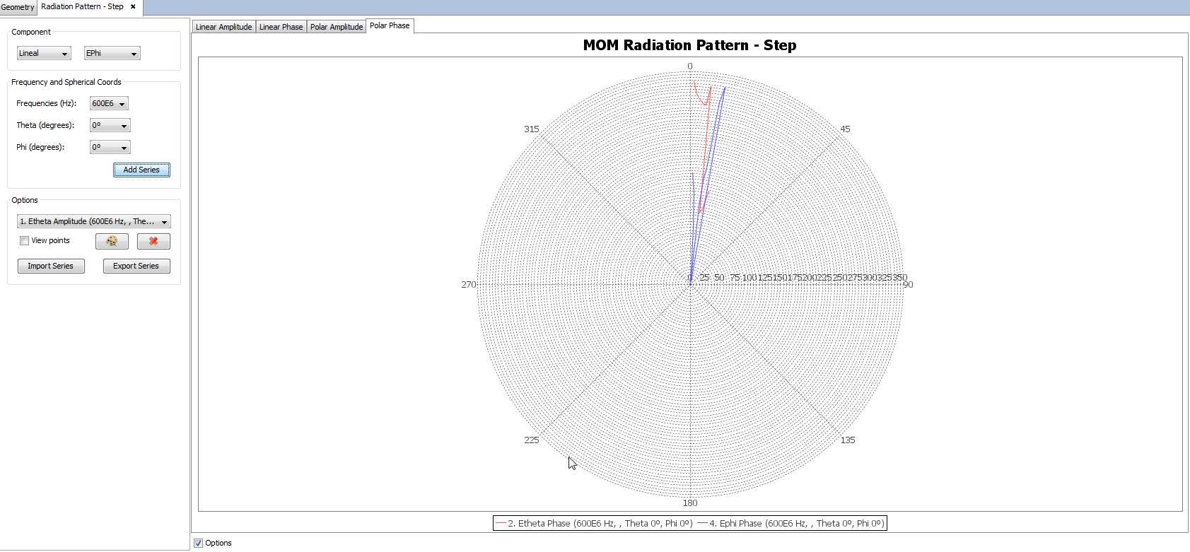 The user can also switch between the linear graph and the polar graph to visualize far field results. It is possible to visualize the Linear Phase, Polar Amplitude and Polar Phase by clicking on their respective tabs.