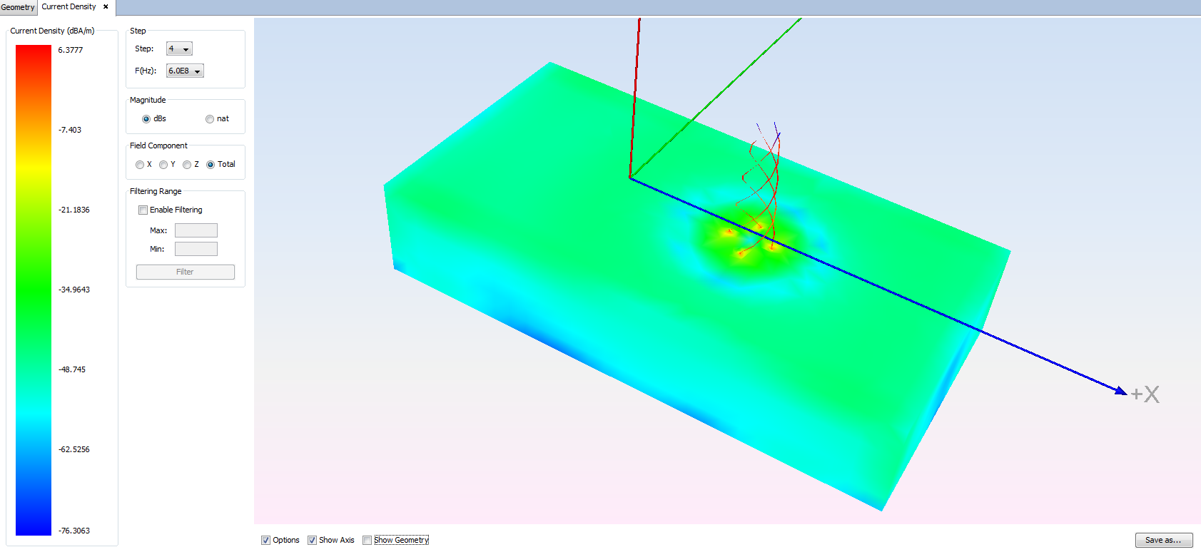 • Show Geometry Enable this option to visualize the meshed geometry together the current density.