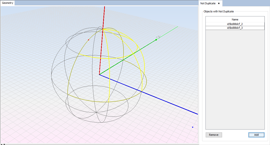 Selecting the objects on the geometry panel and clicking on Add button, the object names will be added to the list of object which will be not duplicated. Use the Remove button to delete objects from the table.