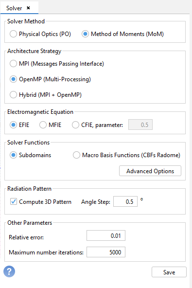 - If the macro basis functions (CBFs Radome) option is selected, then the CBFM-MLFMA (Characteristic Basis Function Method - Multi-Level Fast Multipole Algorithm) is used instead. This option is only available for the analysis of antennas composed by radomes.