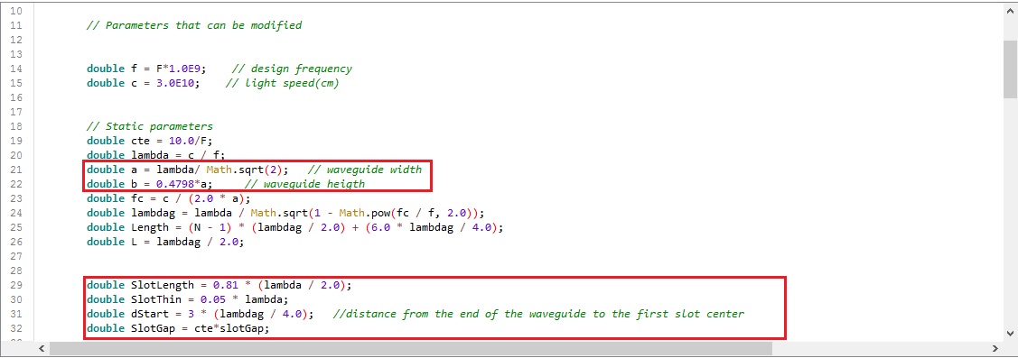 In our case, as we want a 12-slot feeding waveguide N= 12, F=10 Ghz, angle=0 and slotgap = 0.243953 cm