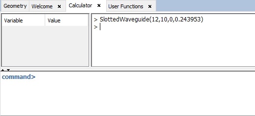 Select Tools --> Calculator option on the menu bar and write SlottedWaveguide(N,F,angle,slotgap) on the command line.
