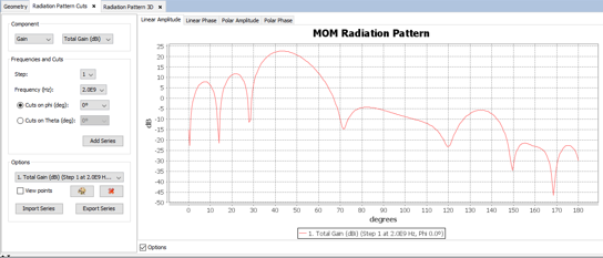 The radiation cuts can be visualized by clicking on Show Results - Radiation Pattern - View Cuts.