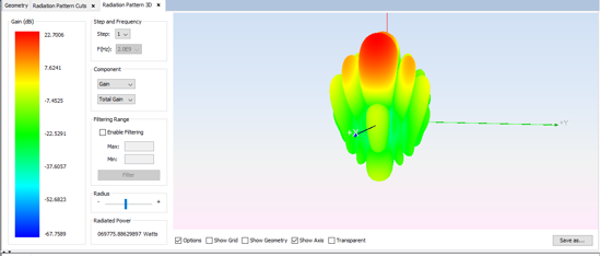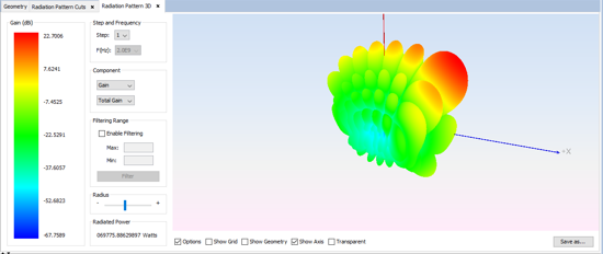 The radiation pattern can be visualized by clicking on Show Results - Radiation Pattern - View 3D Pattern.