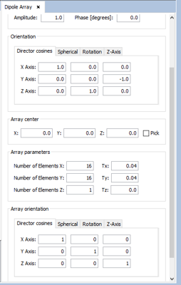 Click on Source - Dipole - Dipole Array to create an array of 16x16 electrical short dipoles, with a spacing of 0.04 m, that are oriented following the y-axis. The array is located on the XY plane. The spacing of 0.04m is equivalent to a spacing of 0.267 in units of lambda, at a frequency of 2 GHz.
