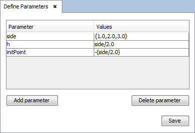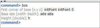 Select 'Geometry --> Parameters --> Define Parameters' option from the menu bar. Then, on the panel, set the follow parameters. 'side' parameter will be the values for the size of the box in width and depth, 'h' parameter will be the height value on the box and 'initPoint' will be the value for the initial point coordinates on the base of the box. To obtain more information about parameters definition see Parameters.
