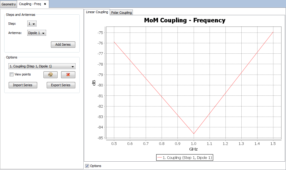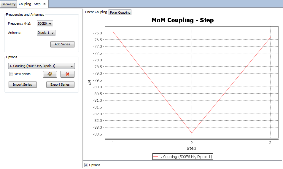 On 'Show Results --> Coupling' menu, other results are present such as 'View Coupling by Step' and 'View Coupling by Frequency' and this option display the values for one selected point for each step or frequency.