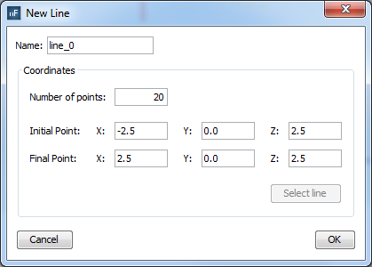 To add a line visualization, select 'line' on the selector of 'Geometry Types' section and click on 'Add' button. The line parameters panel will appear, then configure the values as the next figure show and accept it clicking on 'OK' button.