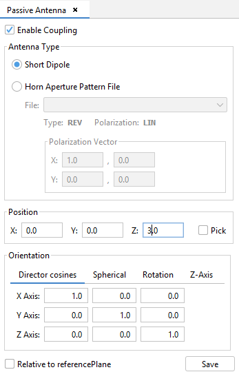 Select 'Output --> Passive Antenna' option. On the panel show, select the 'Enable / Disable Coupling' check box and set the parameters as the next figure. Then save the parameters and the passive antenna appears as a magenta dipole.