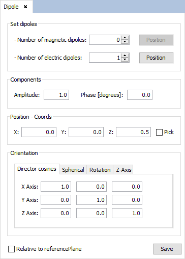 Select 'Source --> Dipole --> Dipole Antenna' option and set the parameters as show the next figure. Then save the parameters and the dipole appears.