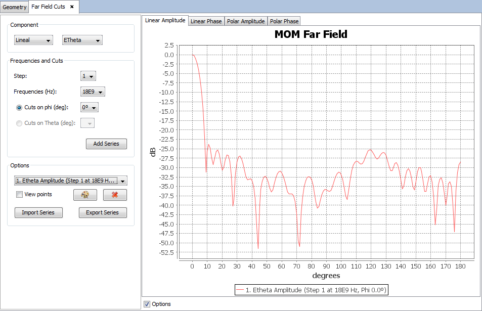 Selecting other values for the component, step, frequency or cut parameters and clicking on 'Add Series' button a new cut will be added to the selected parameters. On 'Show Results --> Far Field' menu, other results are present such as 'View Cuts by Step' and 'View Cuts by Frequency' and this option display the values for one selected point for each step or frequency.