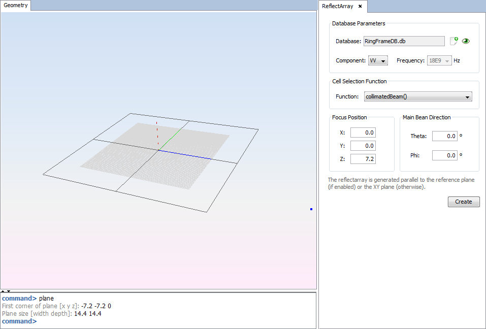 Select the plane previously created to generate the reflectarray over it. The reflectarray layout is generated placing in each cell the structure of geometries with the phase value closest to the phase value calculated by the user-selected function for this purpose. Then, click on 'Create' button and wait until the reflectarray layout is created.