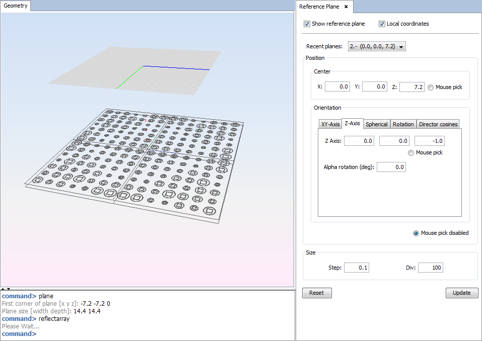 First, select 'View--> Reference Plane' and set the parameters as the next figure shows, then click on 'Update' button to put the reference plane as the figure: