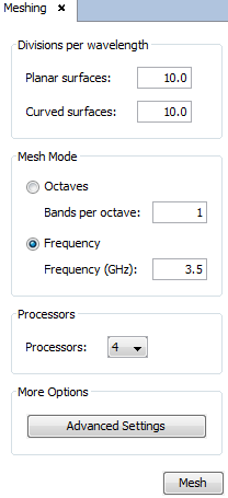 Click on Meshing - Create Mesh option on the menu bar. To use the same mesh for all the frequency sweep, select the Frequencyand specify the upper frequency of the range, 3.5 GHz. Select the available number of Processors, and then launch the meshing process by clicking on Mesh button.