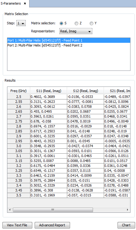 When the simulation process has finished, the S-Parameters are enabled within the results menu. Click on Show Results menu and S-Parameters option to visualize this parameters. The panel with the available options to visualize the S-Parameters is open on right side.