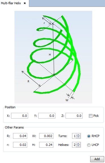 The Multi-filar Helix panel is open on right side. Set all parameters by default except the number of Helixes, which is set to 2. Then, this primitive provide two ports defined one in each Helix. Confirm the antenna definition by clicking on Add button. After that, close the Multi-filar Helix panel.