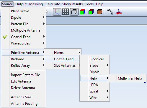 Open the Source menu and navigate to click on Primitive Antenna - Coaxial Feed - Helix - Multi-filar Helix option to select an antenna from the primitives.