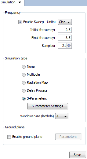 Click on Simulation - Parameters option on the menu bar. Set a Frequency Sweep and the S-Parameters as shown in the figure below. Remember clicking on Save button to confirm the changes.
