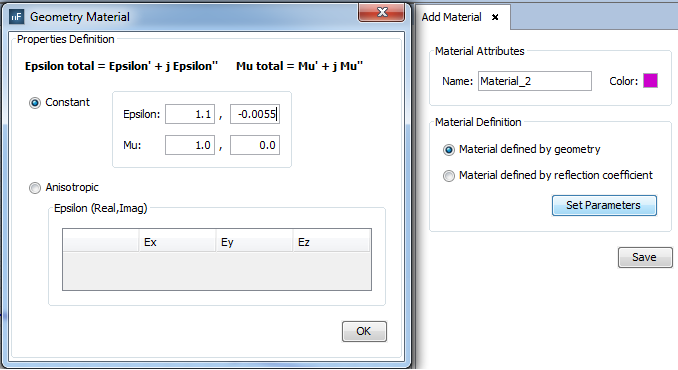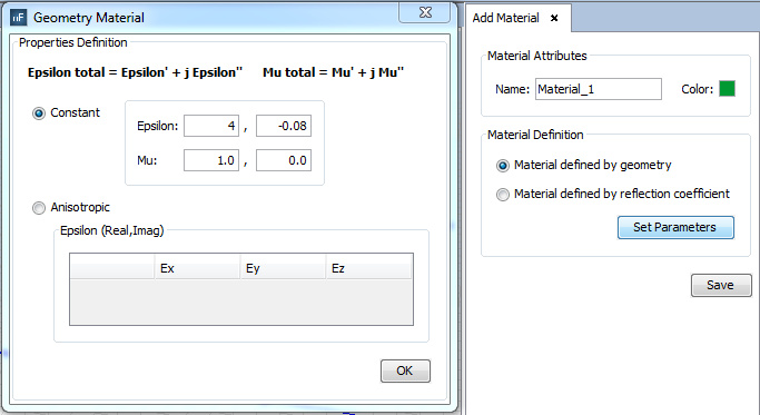 4. Define the materials. Click on Materials – Add menu and then the Add Material panel is open on right side of screen. Set the Name and Color of the materials to be defined, keep the default Material Definition option, that is Material defined by geometry, and then click on Set Parameters button to specify the dielectric values of each material (click on OK button within the Geometry Material window to confirm the dielectric constant assigned). Remember clicking on Save button after defining every material.