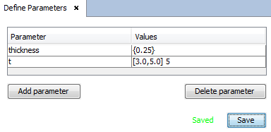 5. Define the parameters. Click on Geometry – Parameters – Define Parameters, and then the Define Parameters panel is open on right side of screen. Unless it is not necessary to add the thickness of the Material 1 as a parameter because it has a fixed value, we will define its parameter to create the geometry also as a full parametric model. To assign a fixed value to a parameter, the value must be inserted between “{ }” characters. The interesting parameter is the thickness of the Material 2, which we have named t, and it must be ranging between 3 and 5 millimeters. To assign a range of values to a parameter, the initial and end values are inserted between “[ ]” characters and separated by spaces, and then the number of samples must be specified. Remember click on Save button before closing this panel.