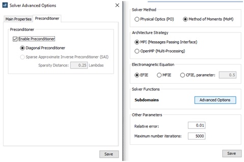 7. Solver parameters. Click on Solver – Parameters menu to open the Solver panel on right side. The only parameter to be modified in this document may be the Preconditioner one that may be enabled or disabled for speeding-up the solver convergence. Click on Advanced Options button to open the Solver Advanced Options window, then select the Preconditioner tab and enable or disable the option Enable Precontioner as desired.