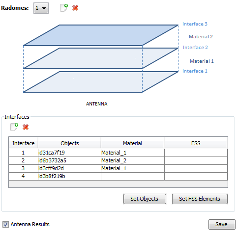 In the Radome panel, no radomes are created so click on Add Radome button to insert a new radome. Then, the table of interfaces of the selected radome (1) is loaded below. As we have shown in Figure 1, the radome is made of 4 interfaces that define the 3 layers, so click on New Interface button twice to get the 4 interfaces.