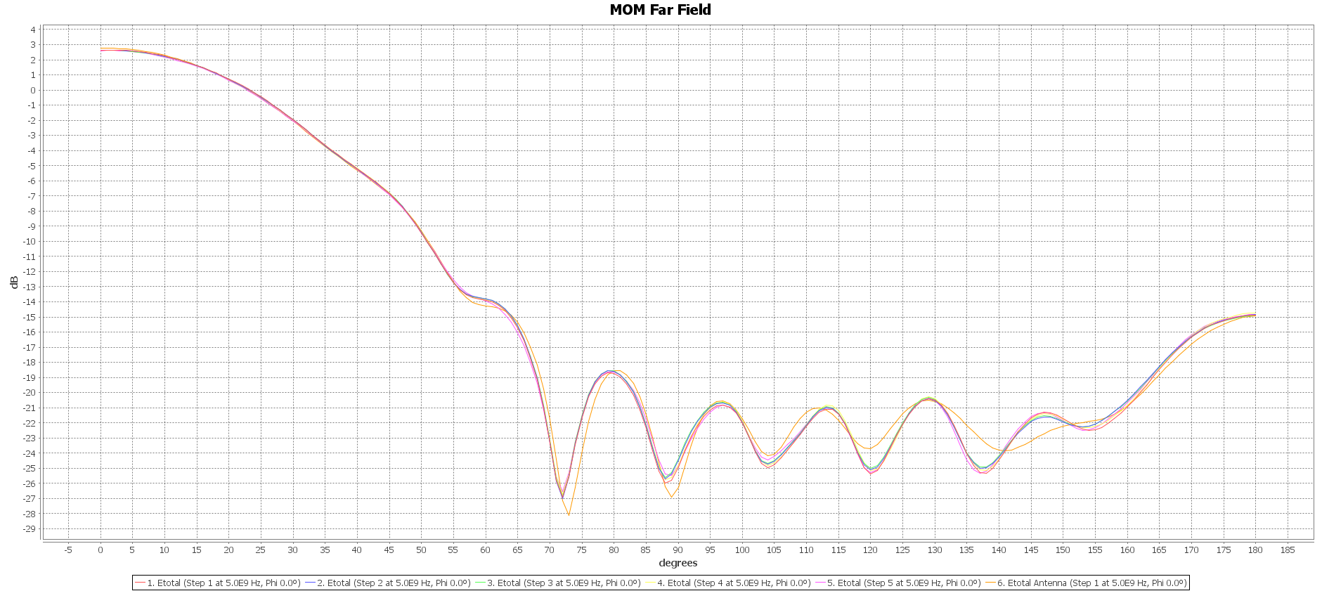 Figure 11. Cut Phi = 0 comparison - radome steps and isolated antenna