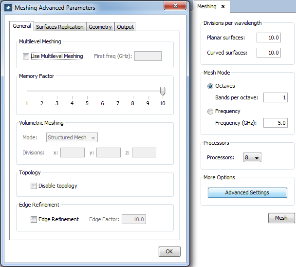 The only parameters modified in the meshing process are the number of Processors and the Multilevel Meshing Mode (click on Advanced Settings to open the Meshing Advanced Parameters window), which has been disabled. Click on OK and Mesh buttons to confirm the changes and mesh.