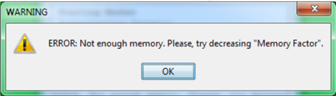 Note that the memory factor is limited by the available memory in the computer. If the memory resources exceed the available memory, a dialog will appear to suggest decreasing this factor: