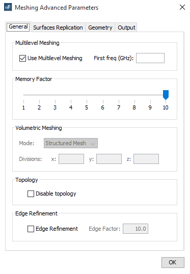 • Memory Factor. This option allows a reduction of the memory resources required in the mesh generation process. The memory allocation is an automatic feature in this process, so the highest one is selected by default to ensure that the mesh will be successfully obtained.