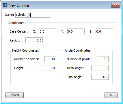 A cylinder requires a valid name, coordinates for the base cylinder (Base Center), its radius (Radius) and the height and angle coordinates. For the Height Coordinates, the Height and the Number of points must be specified. For the Angle Coordinates, the user must introduce whether a complete or an incomplete cylinder is to be generated by specifying the Initial angle and Final angle parameters. It is also possible to change the Number of points.
