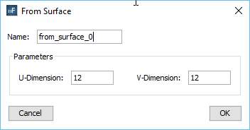 Using this option it is possible to create observation points using a surface as a reference. To create one of these geometries, a NURBS Surface has to be previously selected. This operation is usually done by selecting a previously created surface in the project, or exploding an object to select the desired surface. Then, a new geometry type is added. The number of points in U-Dimension and V-Dimension are parameters for this kind of geometry.