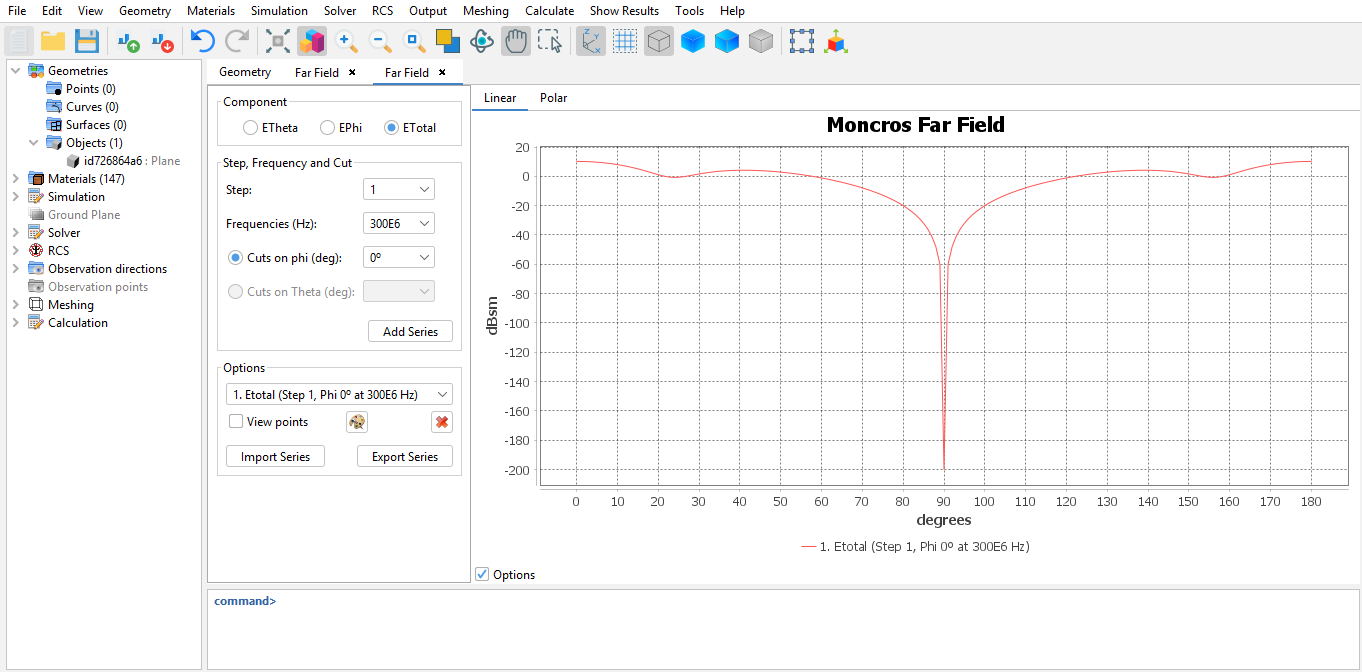 This command plots the amplitude or the phase of the RCS computed for each angular cut. Several cuts and frequencies can be plotted in the same graphic. To plot a graph, the user must select the RCS component, the frequency and the cut. The user can press the button “Add Series” to plot the new graph. In the case that the user has set up a parametrized geometry, it is possible to select the step to visualize the results for.