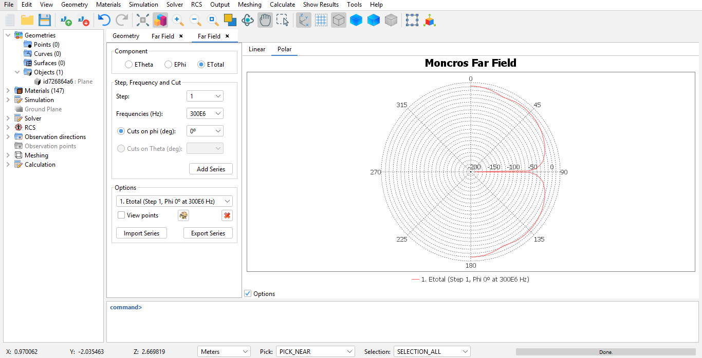 The user can also switch between the linear graph and the polar graph to visualize far field results.