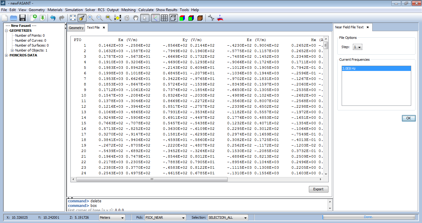This option can be used to view the numerical results for the near field for a particular step and frequency. Select this menu item to display the Near Field Text panel. In this window, it is possible to select a step if more than one step exists, and one of the simulated frequencies. There will only be one frequency available for selection. However, if multiple frequencies are available as part of a frequency sweep simulation, they will be available for selection.