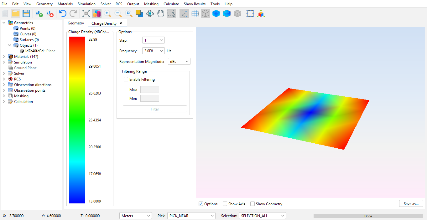 This visualization option allows the user to see a representation of the charge density. A color legend shows the magnitude of the charge values corresponding to each color shown on the geometry (at the right side of the screen).