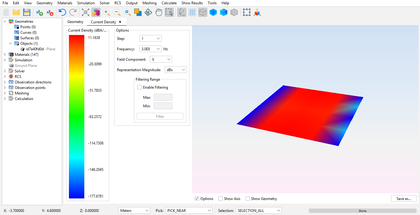 This visualization option allows the user to see a representation of the induced currents. A color legend shows the magnitude of the current values corresponding to each color shown on the geometry (at the right side of the screen).